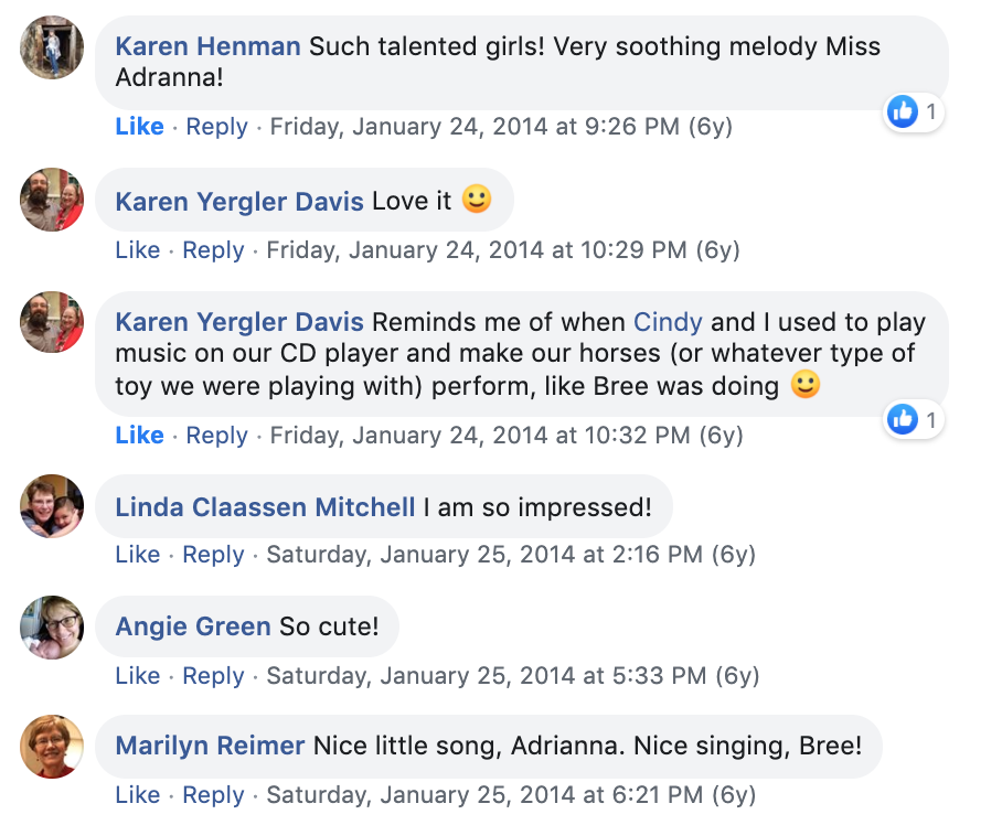 Once Adrianna has played a song once or twice, Bree can often be heard in the background singing along (with her own made-up words). Bree picks up tunes quickly.