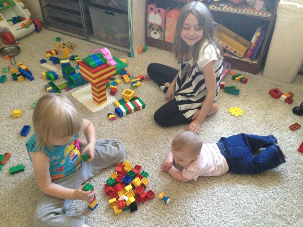 The girls love their Legos. Cate enjoys hanging out with her big sisters on the floor.